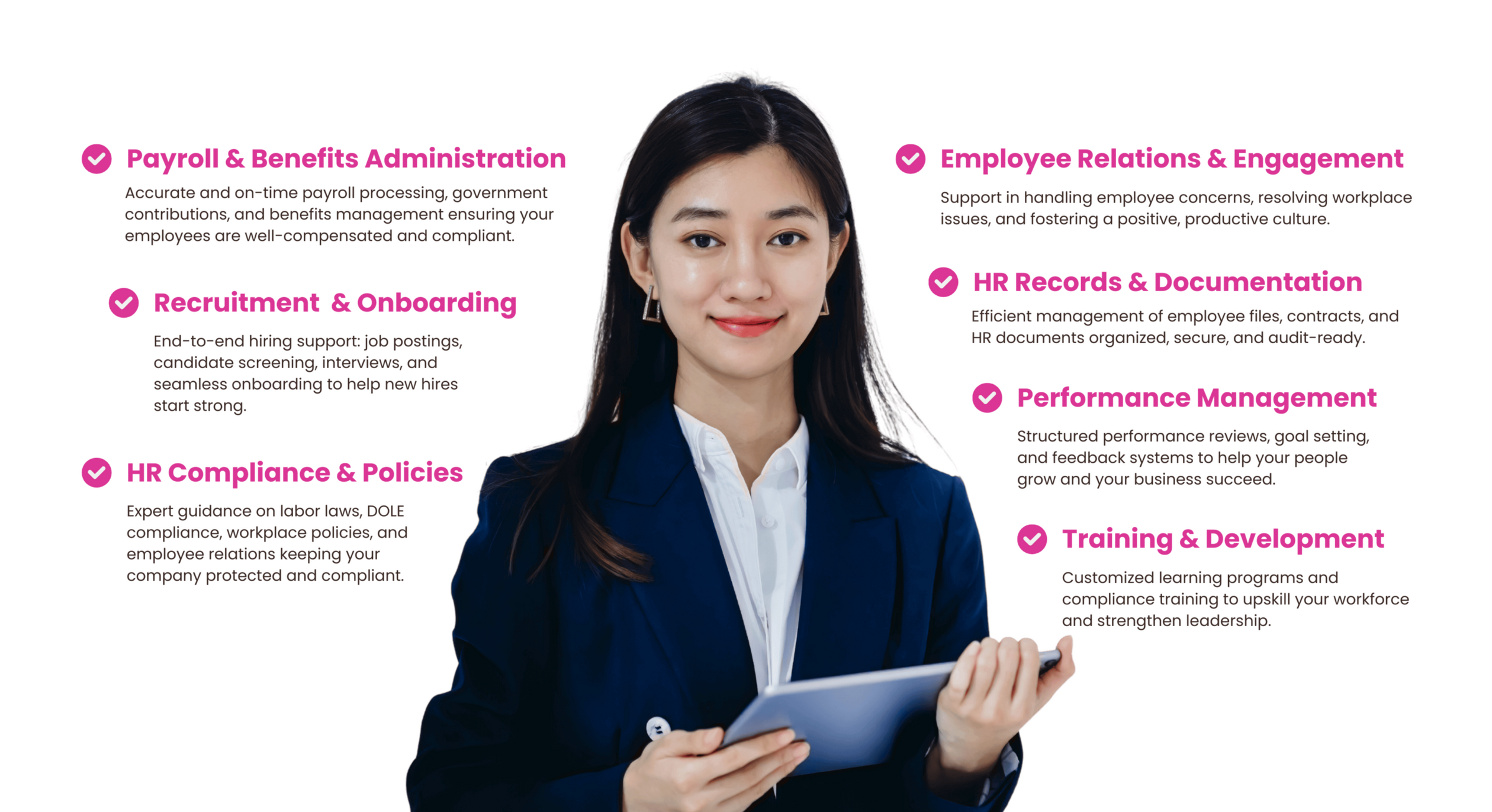 Mint HR Philippines is a boutique HR company built to support businesses with practical and people-focused solutions. We take care of the essentials such as payroll, compliance, recruitment, employee relations, and day-to-day HR tasks, so you can focus on growing your business and leading your team.Our promise is simple: hands-on HR support that’s reliable, affordable, and rooted in integrity. We’re here to make HR easy and accessible for every small and growing company in the Philippines.